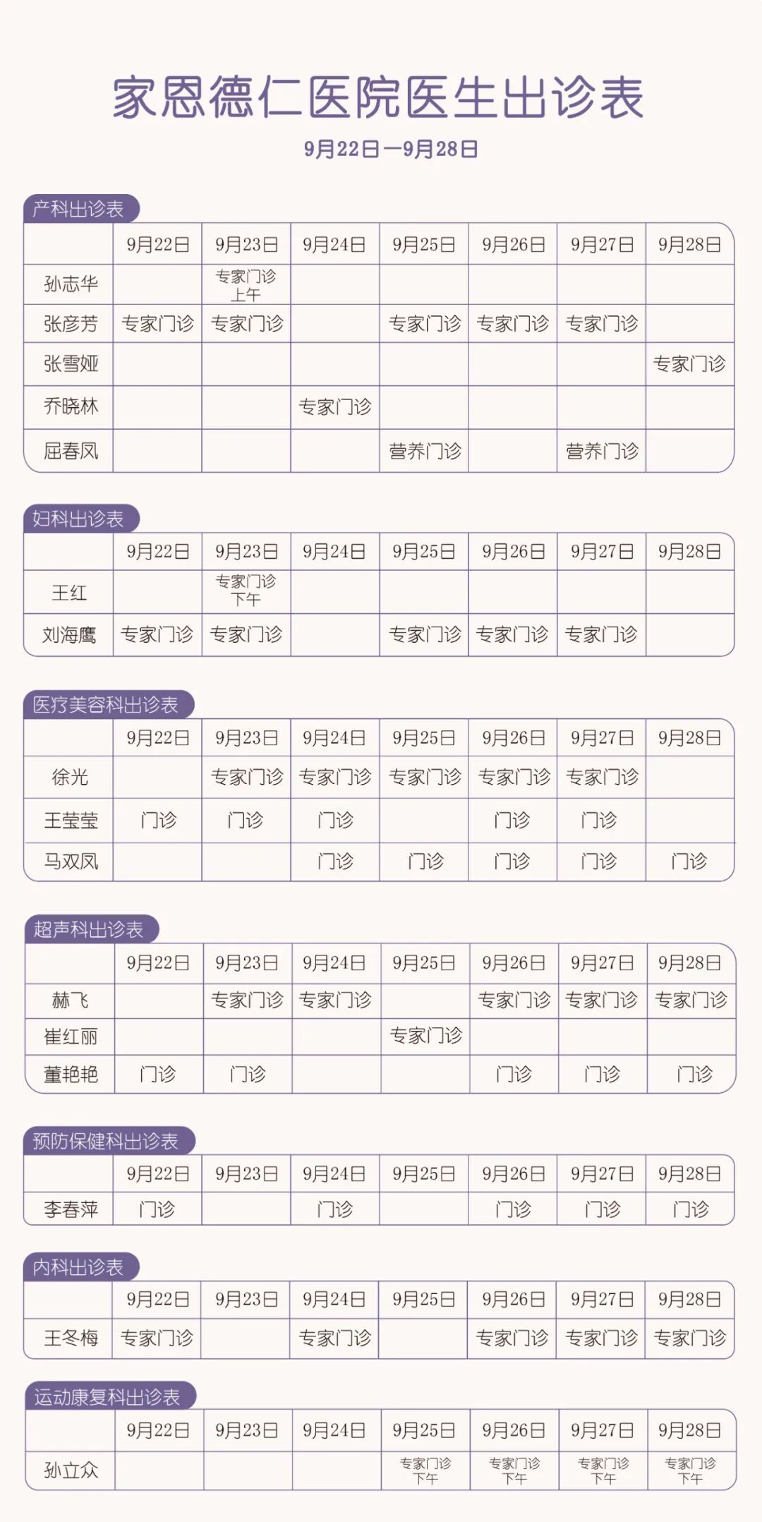 医生出诊 | 9月22日—9月28日家恩德仁医院各科室医生出诊
